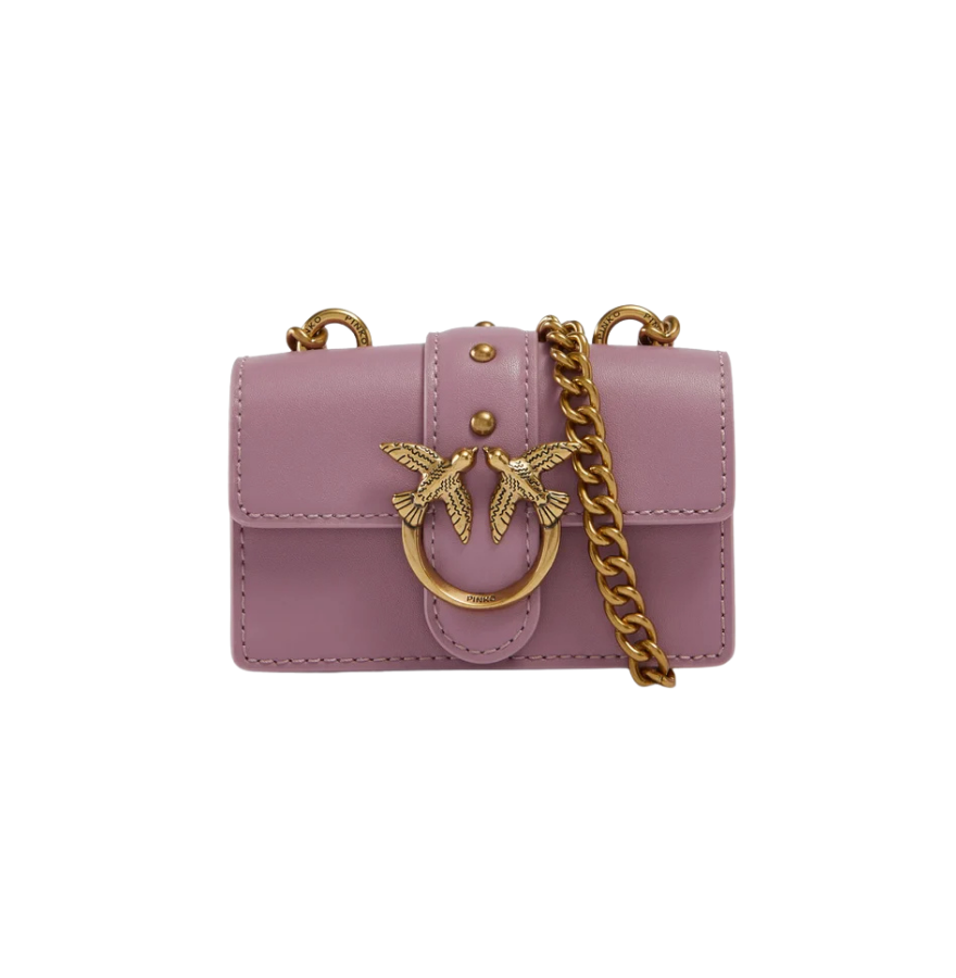Micro Love Bag One in soft, silky leather. The leather strap with metallic studs is accompanied by the iconic Love Birds Diamond Cut metal buckle. Microfibre inner lining. Round-link metal-chain strap.
