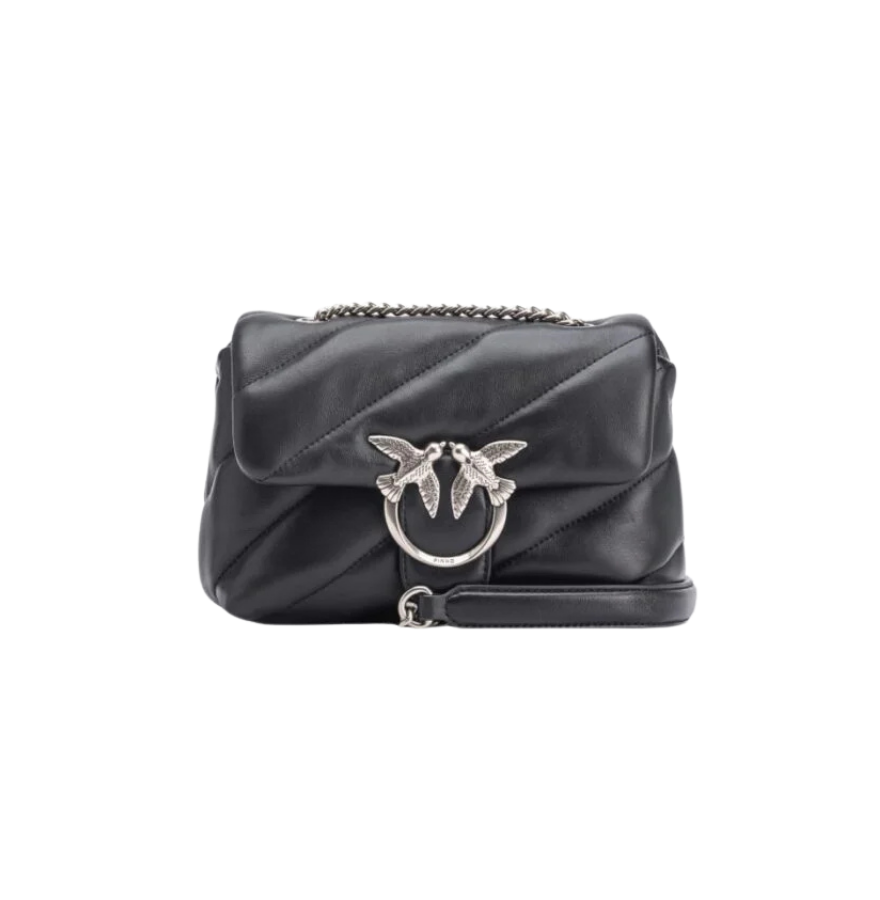 Mini Love Bag Puff in soft nappa leather featuring large slanted quilting. The fastening is complete with the iconic metal Love Birds Diamond Cut buckle. The accessory boasts a microsuede-lined interior, complete with a zipped centre divider pocket and slip pocket. The shoulder strap combines the classic round metal chain with a practical nappa leather shoulder pad.