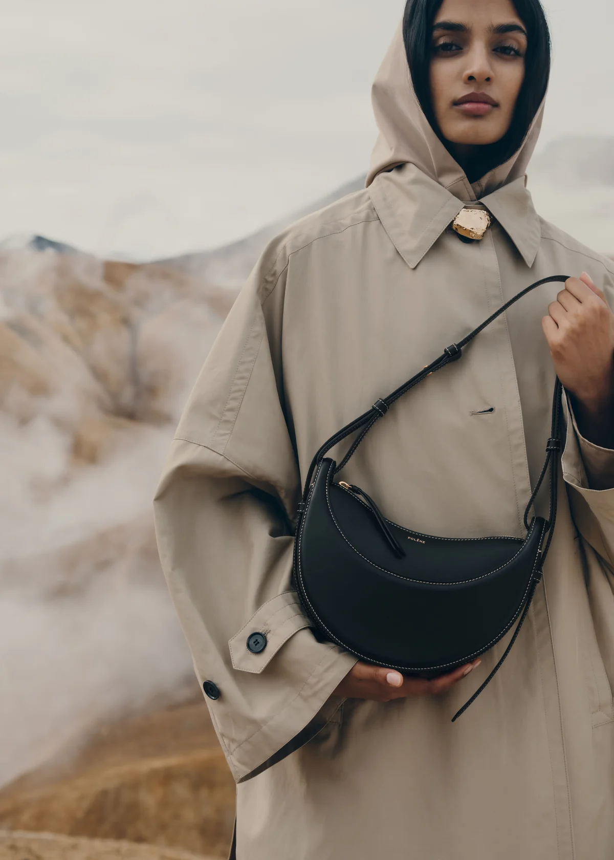 With its rounded shape, foam padding, and hand-sewn stitches, the “Numéro Dix” is an equestrian nod to saddlery. Its half-moon design plays on a juxtaposition of curves.