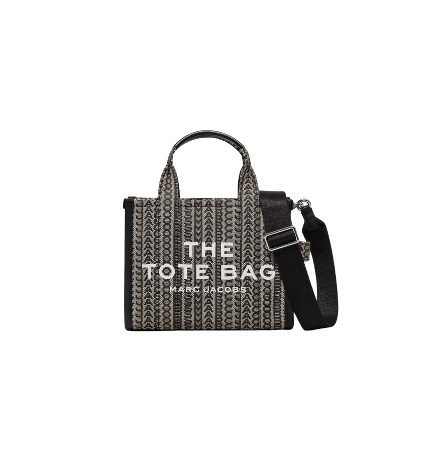 The monogram appears on a small tote made in rich jacquard. Wear it by the leather handles or go hands-free via the removable crossbody strap.