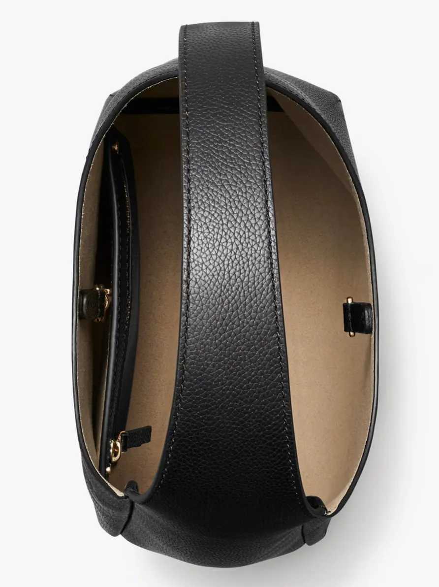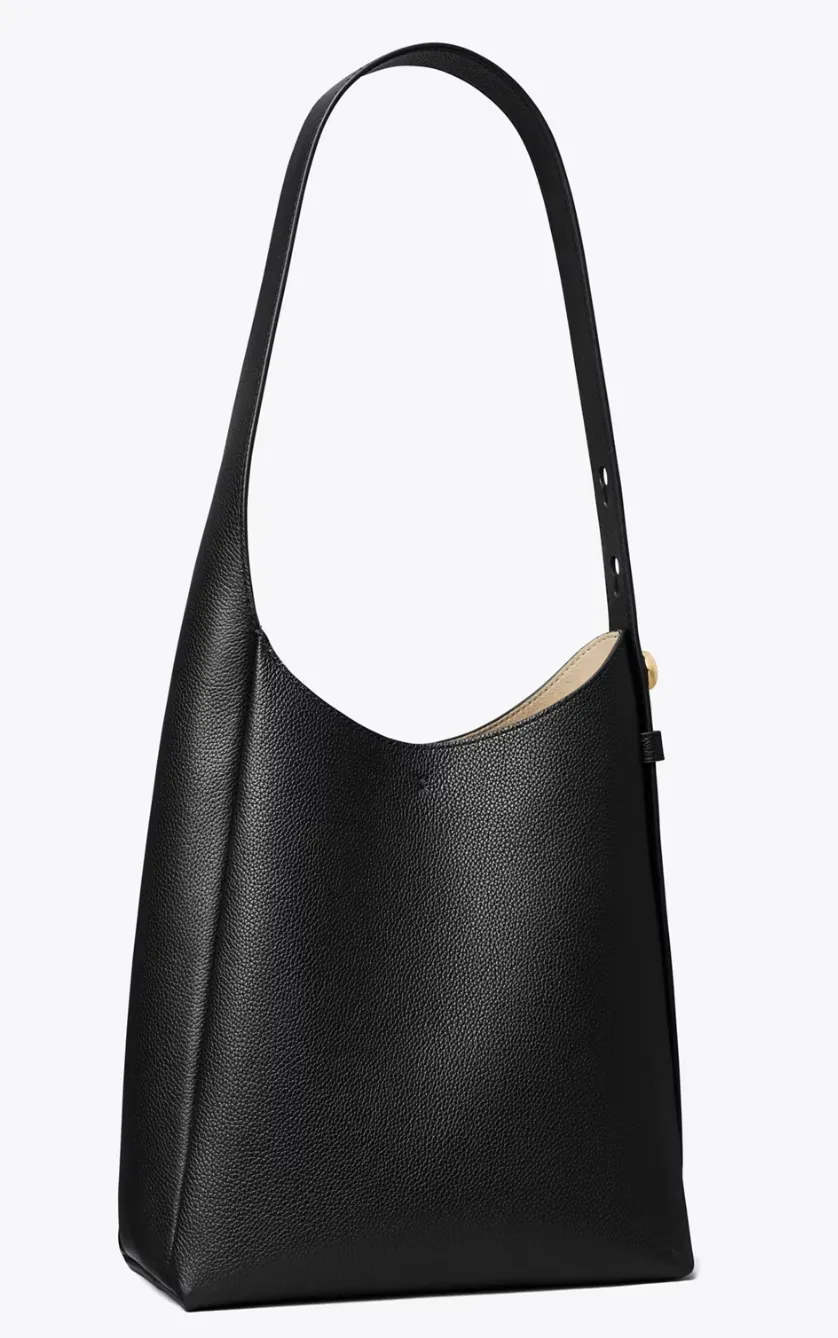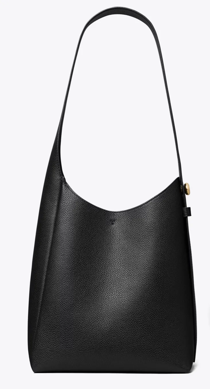 Crafted from soft, pebbled leather, this lightweight bag offers a spacious interior with a secure zip pocket. It’s designed with a slender, adjustable shoulder strap and the brand’s signature button logo. Created in collaboration with a Leather Working Group-certified tannery, the bag supports high standards in leather manufacturing and responsible chemical management. With its elegant design and practical features, this hobo bag makes a versatile accessory.