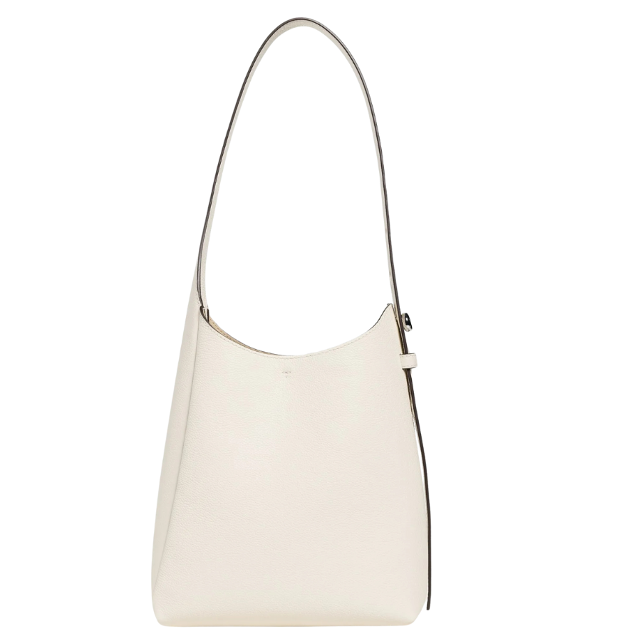 Crafted from soft, pebbled leather, this lightweight bag offers a spacious interior with a secure zip pocket. It’s designed with a slender, adjustable shoulder strap and the brand’s signature button logo. Created in collaboration with a Leather Working Group-certified tannery, the bag supports high standards in leather manufacturing and responsible chemical management. With its elegant design and practical features, this hobo bag makes a versatile accessory.
